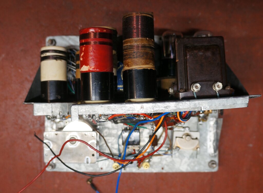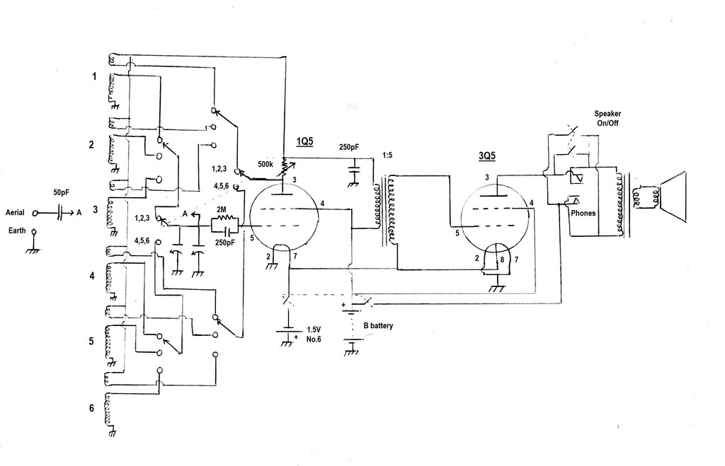 The open chassis set's physical appearance mimics the Lamphouse design, but on closer looking at the actual Lamphouse circuit, the 1Q5 operates in space charge mode, with +1.5V on grid 1, and the signal fed into grid 2. However, both sets I have use the conventional tetrode connections, with the signal fed into grid 1 and the 9V supply fed to grid 2.