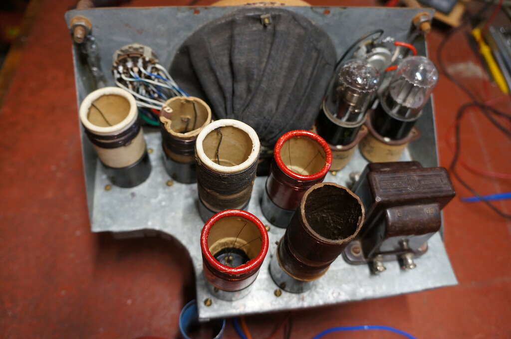 The tuning capacitor is a rather ancient Stewart Warner, complete with 0-100 dial. It was once fitted with a reduction drive, but the drive gear has been removed. The tuning knob attaches directly to the shaft. The other controls are a rotary on/off switch, and the regeneration control potentiometer. A primitive battery holder for two D cells had been made up on the back of the chassis. Battery holders, as we know them today, were virtually non existent as an individual component available for purchase. There is space at the side of the chassis for the 9V battery. An English made Philips DL36 had been fitted.