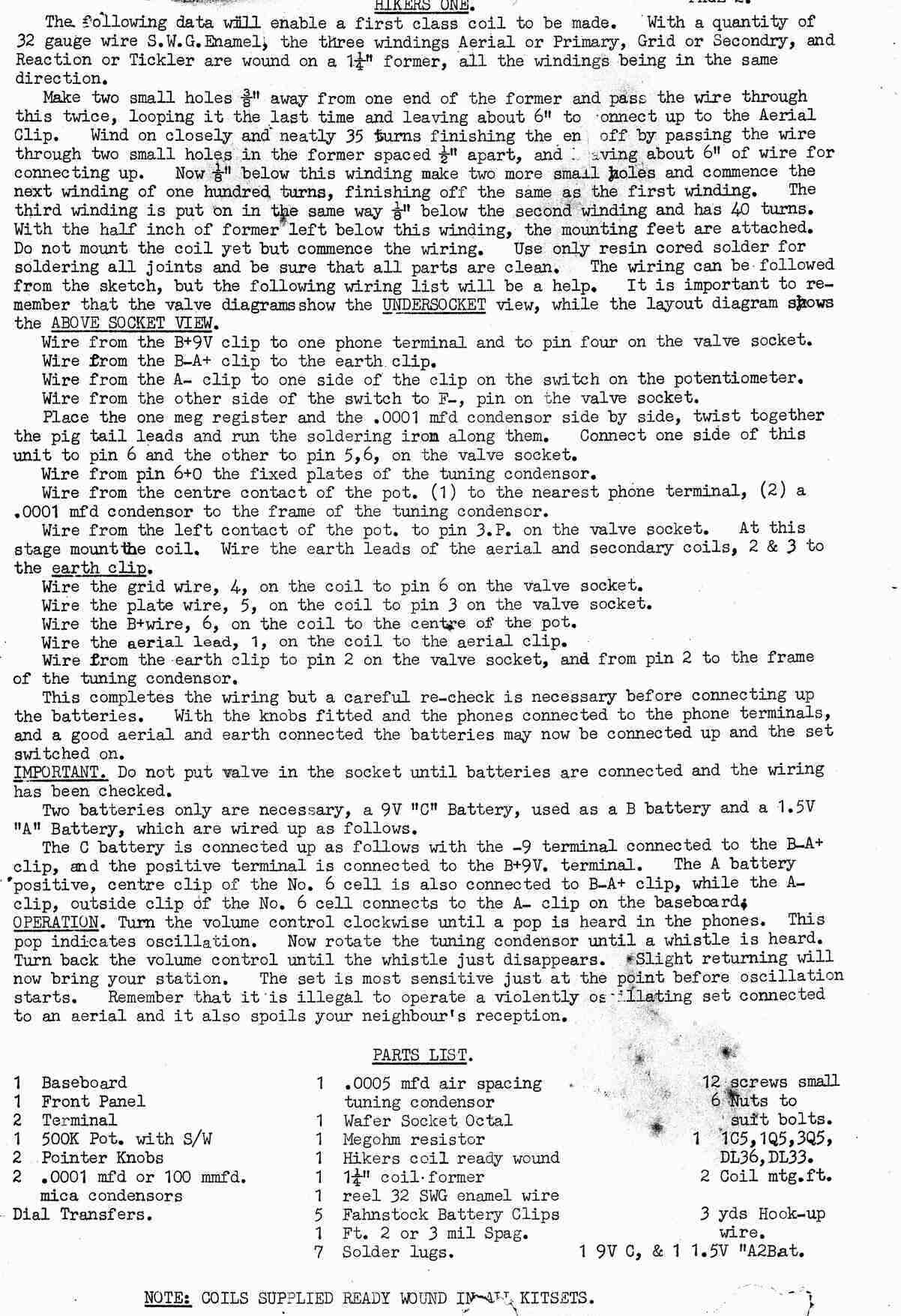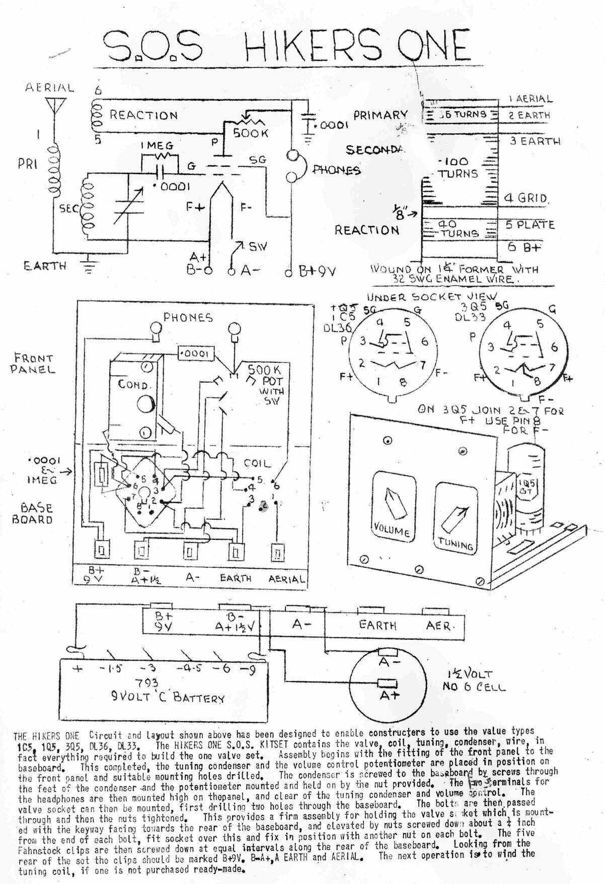 Since the 1Q5 is designed for a relatively high cathode current (11.1mA) at 90V, it could be imagined that when used as a regenerative detector, only requiring a fraction of a milliamp, that operation at lower voltage should be possible. Indeed, good performance was obtained with only 9V, and the Hiker's circuit lived on with its economical B+ supply. Type 1C5 is similar, though less sensitive, and was also recommended for the circuit.