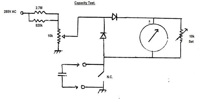 In this circuit, the 100uA meter is made to read AC by the addition of two diodes. It's a circuit commonly seen in analog multimeters. AC supply is about 3V, which is tapped off the 10k calibration pot. This is fed from the 285V winding of the transformer through a resistance consisting of an 820k and 2.7M in parallel. The capacitor under test completes the circuit back to the 3V AC source, when the Test switch is opened.