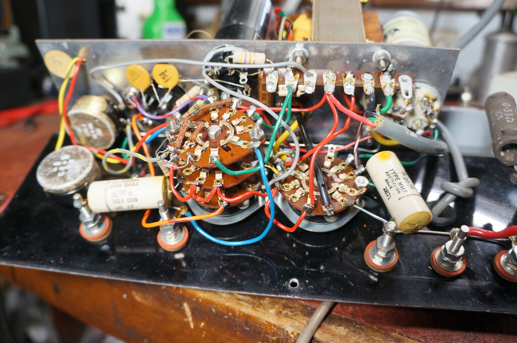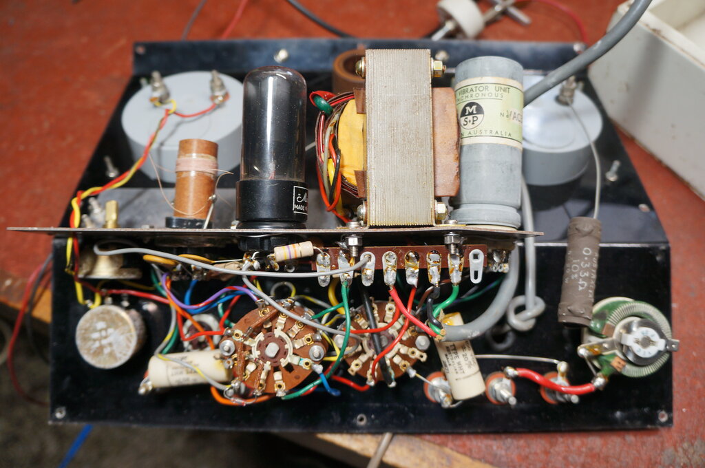 This particular unit was made in late 1971, judging from the date stamps on many of the components. As such, it contains the last generation of Australian made components. I did not feel the need to replace any components. The resistors were of a type which are quite stable, except for the 100 ohm - a carbon IRC type which is always suspect. However, it tested perfectly. The .27uF capacitors are UCC "Di-Pol" types which are metalised polyester. These are not to be confused with the similar looking UCC "Hi-Qual" types, which are paper and usually leaky. There was one waxed dipped paper type; the .01uF connected to the 6V6 plate. Given its location, it would not be problematic if slightly leaky.