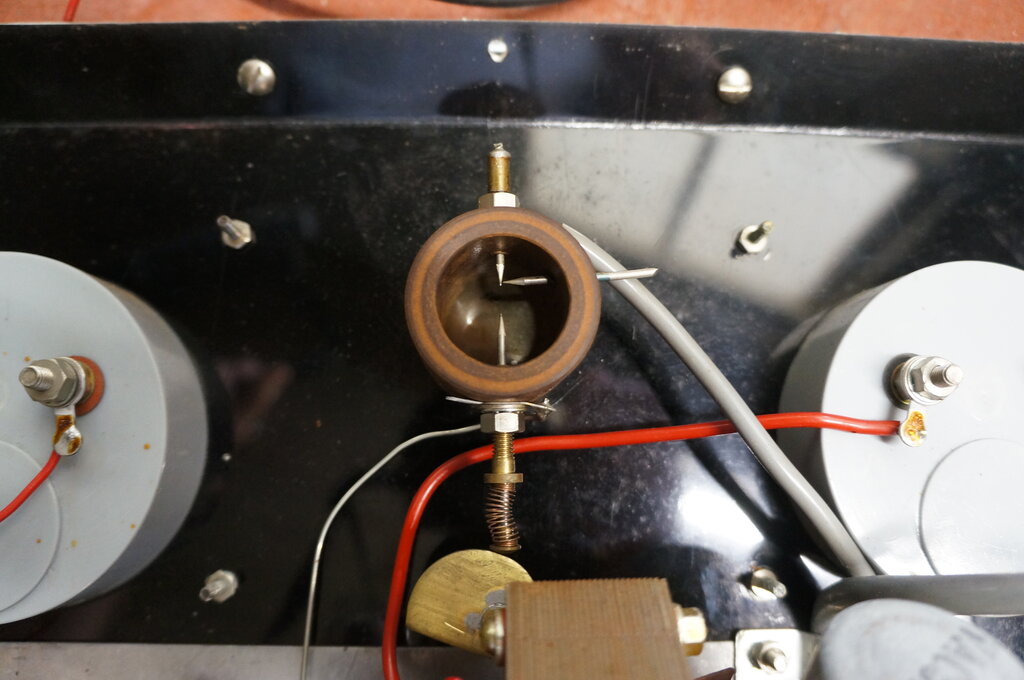 Spark gap. Note the semi-circle shaped cam which adjusts the gap.