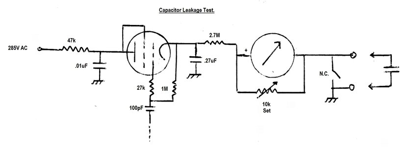 From the cathode, the DC (around 337V) is filtered by the .27uF capacitor and applied to the meter through the 2.7M resistor. The 10k shunt pot is adjusted for full scale deflection on the meter. When the Test switch is opened, the capacitor will ideally charge up and draw no current. Thus the meter will not show any reading. If the capacitor is leaky, current will be drawn through the meter. The meter scale is calibrated in the rather arbitrary terms, "Good", "Fair", and "Leak". The "Fair" indication corresponds to around 3.3M of leakage resistance.