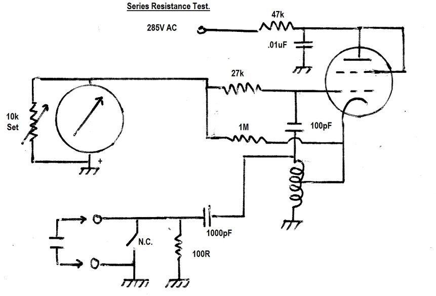 Now, if the capacitor under test should have too much series resistance, this will be effectively in series with the 1000pF, and the oscillation level will drop. Note that the frequency used is so high (430kc/s as against 50c/s), that any capacitor in the intended testing range will appear as a virtual short circuit (less any series resistance). This is why this circuit is not influenced by the capacitor value, and only shows series resistance.