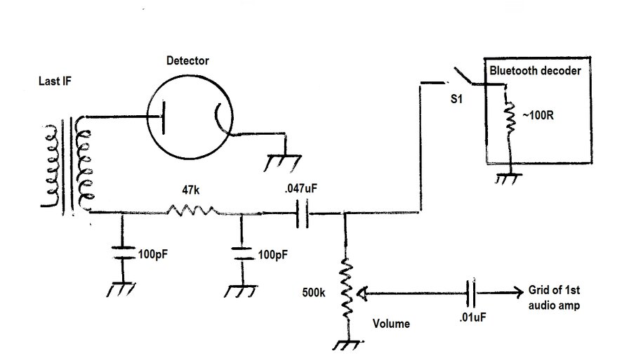 Things were looking very promising without the resistors. With the module not paired, it could be connected across the volume control without any loading. It turned out that the detector output of the radio did not actually need to go through the relay. The output impedance of the module was low enough to block any off air reception, when the relay switched on. Since both the track and the wiper of the volume control are isolated by capacitors, the module does not alter the DC conditions of the 12AV6, the detector, or the AGC circuits. Similarly, the DC present at the detector does not affect the module.