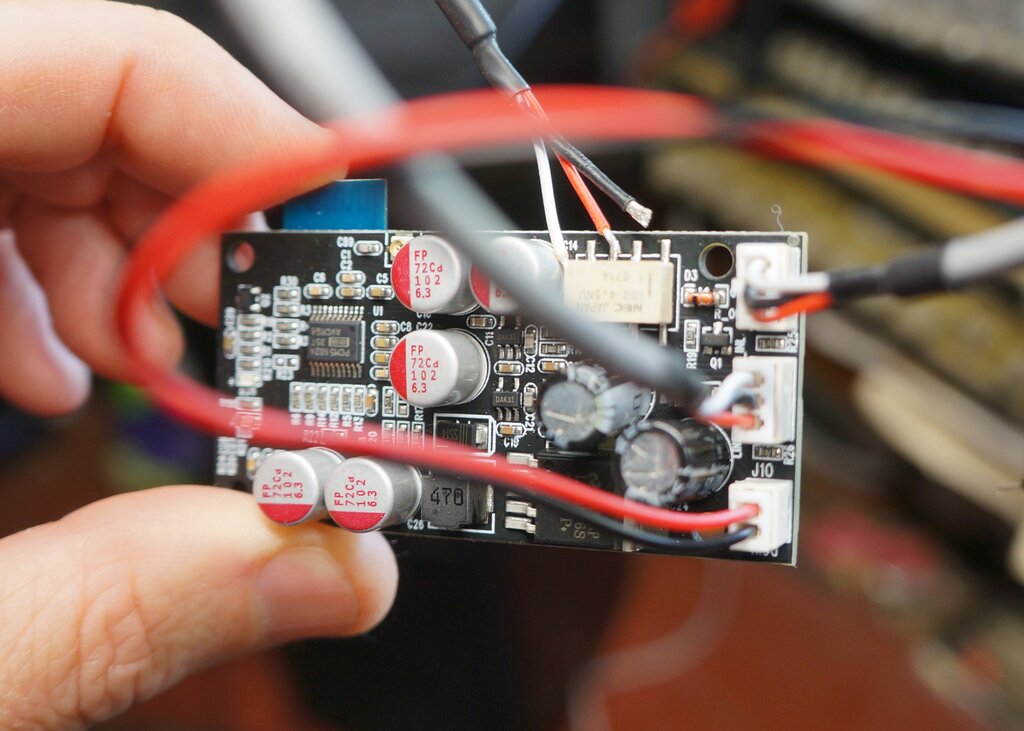 There was some vibrator buzz noticeable now, which I assumed to be the result of an earth loop. This was confirmed by powering the module from an external supply, whereupon it was quiet. The problem was fixed by installing a 27 ohm resistor in the 12V feed to the module.