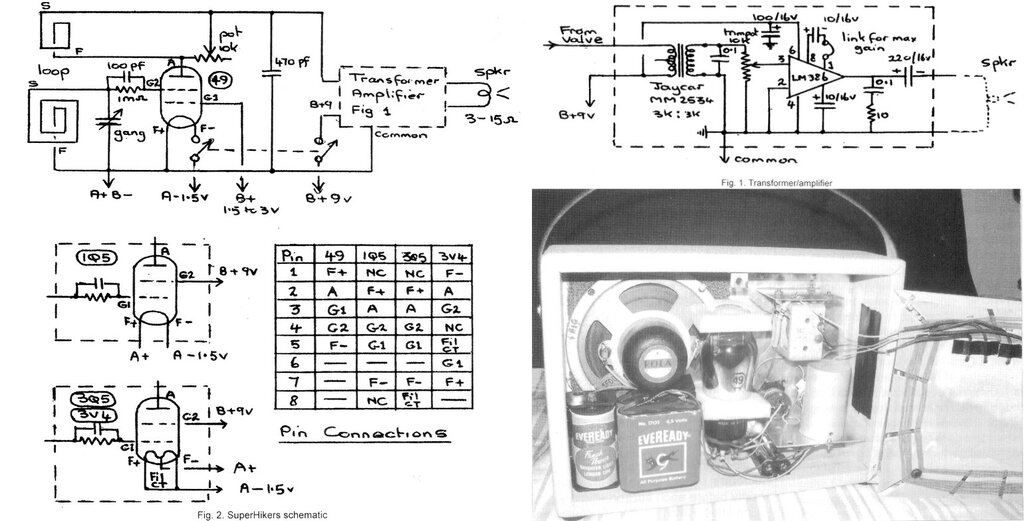 To vintage radio enthusiasts in Australia and New Zealand, the "Hiker's One" name refers to a one valve regenerative receiver, operating from a low B+ voltage; typically 6 to 13.5V. The attraction was of course, that the otherwise necessary (and expensive) 45V B battery was done away with. Instead, a cheap 9V bias "C" battery could be used, or a combination of similarly inexpensive torch cells. The valve filament was powered from a 1.5V No. 6 dry cell, or a couple of paralleled torch cells. Low voltage B+ operation was achieved by using a type 49 valve in space charge mode.