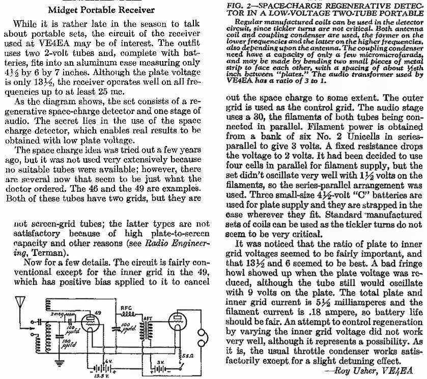 Many articles on the Hiker's circuit claim that the design originated from a Popular Mechanics article in 1936. In fact, the circuit was first presented by a Canadian amateur in QST for October 1935. It was a two valve receiver, with a 49 operating as a regenerative detector, and a 30 operating as an audio amplifier. However, it would be true to say that the Popular Mechanics article is what popularised the design, since QST was exclusively an amateur radio magazine.
