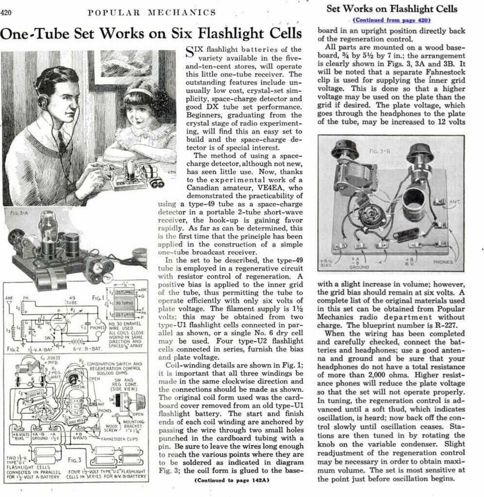 A modified version of the circuit, without the audio stage, was presented as a constructional article by Popular Mechanics for September 1936, its claim to fame was that only six 1.5V cells were required to power the whole set.