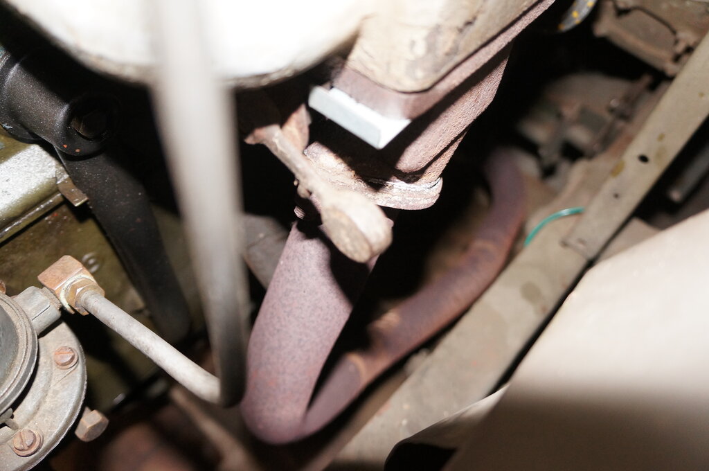The rear bolt went in similarly, but is further from the access hole. I also had to remove one of the steering box bolts first. I was getting good at this by now, and didn't take as long to get in.